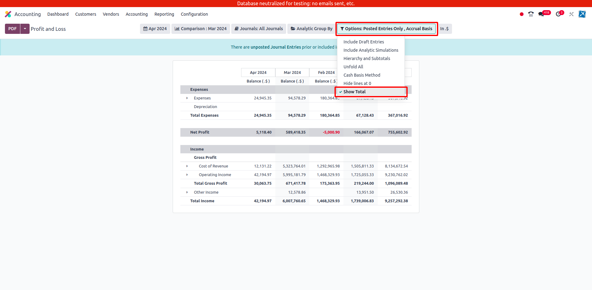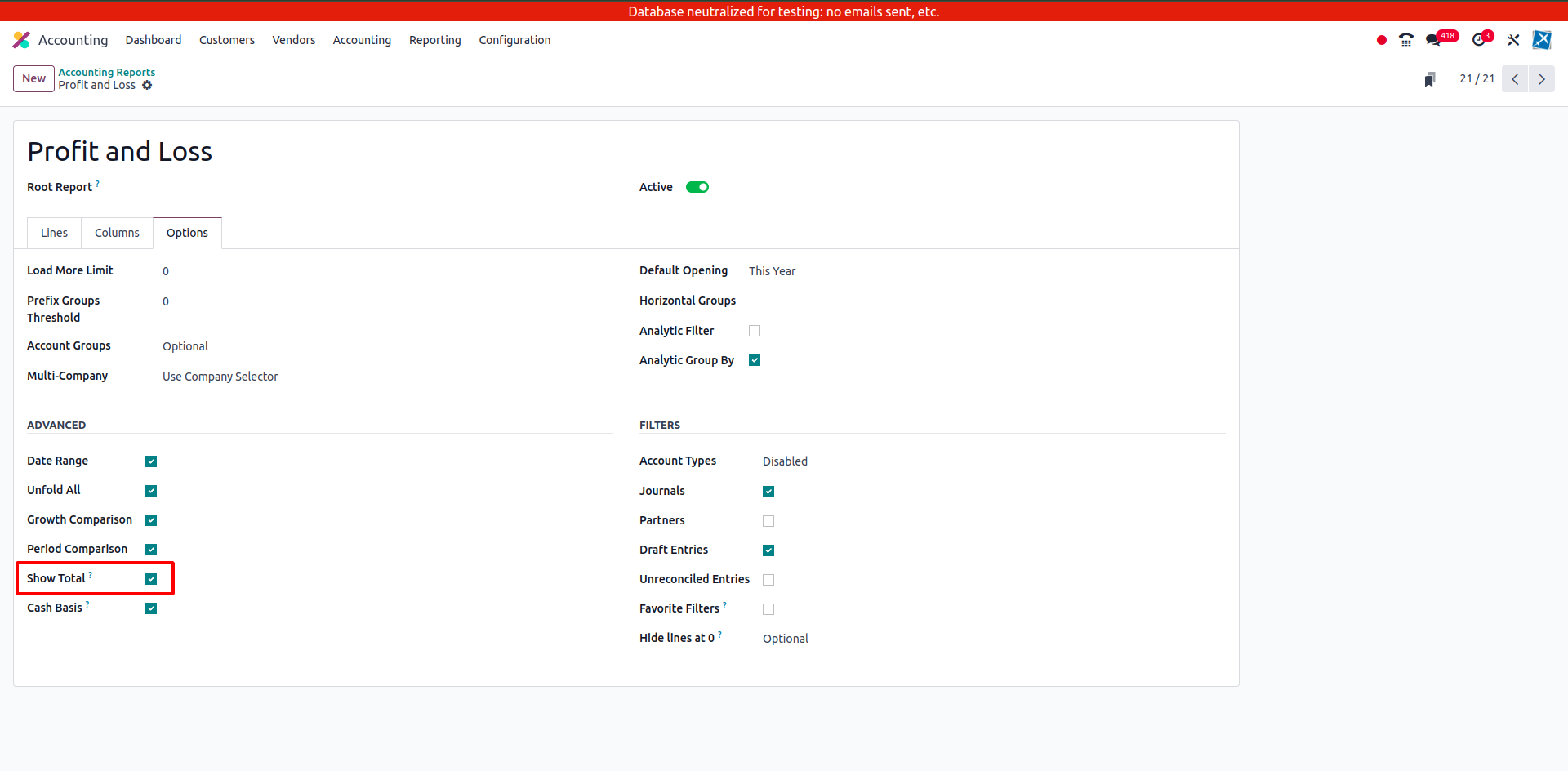 After enabling the 'Show Total' field, upon opening the report, you'll notice a filter section at the top. Within this section, you'll find an option labeled 'Show Total'. Activate this filter to display the total column in your report.